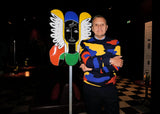 His artistic universe is based around a chromatic range of blue, yellow and red – one of the biggest representations of which was to dress Pope John Paul II for the World Youth Day in 1997. He has collaborated with many artists including Keith Haring, Lady Gaga, Robert Mapplethorpe and Pedro Winter. His art is also expressed through installations, chalk street art, drawings and paintings. From 2018 to 2022, he designed collections for United Colors of Benetton. In 2021-2022, his artistic work was the subject of an exhibition entitled “The People of Tomorrow” at the children’s gallery of the Center Pompidou